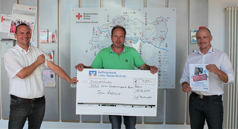 Wir krempeln für Rebecca die Ärmel hoch! Mit diesem Aufruf richten sich die Organisatoren einer großen Typisierungsaktion am 12. September 2020 in Thyrnau – allen voran der BRK-Kreisverband Passau mit der örtlichen Bereitschaft – an die Öffentlichkeit. Die zwölfjährige Rebecca ist an Leukämie erkrankt. Um gesund zu werden und die Erkrankung zu besiegen, benötigt sie unter Umständen eine Stammzellenspende. Im Rahmen der Typisierungsaktion soll die Suche nach einem genetischen Zwilling vorangetrieben werden – für Rebecca, aber auch für andere Patienten, die auf die Hilfsbereitschaft ihrer Mitmenschen angewiesen sind. Wie groß diese Hilfsbereitschaft ist, erfährt das BRK in diesen Tagen in beeindruckender Weise. Die Typisierungsaktion wird von vielen Seiten herausragend unterstützt. Eine ganz besondere Idee aber hatte Josef Schadenfroh aus Tiefenbach. Er hatte von Rebeccas Schicksal erfahren und sich kurzerhand entschlossen, ebenfalls einen Beitrag leisten zu wollen. Anstelle von Geschenken zu seinem 52. Geburtstag bat er seine Gäste um eine Spende zu Gunsten der Typisierungsaktion. So kam die stolze Summe von 350 Euro zusammen, die der stellvertretende Kreisgeschäftsführer Michael Wenig und Josef Schicho von der Servicestelle Ehrenamt, der die Aktion federführend organisiert, dankbar entgegengenommen haben. Beide betonte, wie wichtig es ist, die Aktion Knochenmarkspende Bayern (AKB) auch finanziell zu unterstützen. Die AKB sei auf Hilfe dieser Art dringend angewiesen, weil weder die Krankenkassen noch der Staat die Registrierungskosten von neuen potentiellen Lebensrettern in Höhe von 35 Euro tragen.