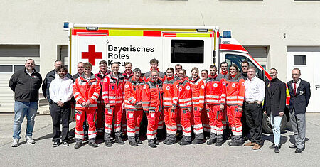 Seit 20. April 2026 informiert der BRK-Kreisverband Passau im westlichen und südlichen Landkreis über die Fördermitgliedschaft. Petra Kerl (3.v.l.) und Anna-Lena Heinrich (links) aus der Fördermitgliederverwaltung, Kreisvorsitzender Walter Taubeneder (5.v.l.) und Kreisgeschäftsführer Michael Wenig (2.v.l.) erklärten zum Auftakt der Aktion gemeinsam mit den Werbern (weiter von links) Brian Schild, Sebastian Stürzer, Dario Pfeiffer, Amir Elkhaiat, Benedikt Ritzinger, Jagtar Badwal und Alexander Kern, warum das Rote Kreuz auf Fördermitglieder angewiesen ist. Foto: Lindmeier